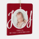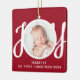 This cute Baby's First Christmas Photo Ornament is decorated with the word JOY in stylish script typography on a red background.
