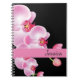 Notebook shown with a black background colour with a lovely pink orchid flowers graphic print and a name sample.