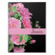 Notebook shown with a black background colour with a lovely pink roses graphic print and a name sample.