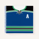 8.5" x 8.5" Spiral Notebook with laminated covers, and a choice of paper style, including sketchbook, ruled, half ruled, graph. The front and back of the notebooks have customizable jersey style designs, allowing you to add your own choice name and number to the back, and an 'A' or 'C' or number on the front, use the boxes to the right of the image to change the text.