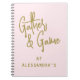 Personalized stationary notebook with the name of the host for example. Feminine, elegant, stylish, pretty, girly aspect. Simple minimalist minimal design with the customizable funny phrase quote saying “ Gather & Game” and the custom name.  A little notebook to keep track of games and sports points score at a fun family or friends gathering, at a card play game, a darts game tournament , corn hole sport game party pr a pickleball sport game . Premium look, neutral pastel candy pink background, trendy gold script handwritten calligraphy and modern clean sans serif font typography. Playdates are fun and relaxing, a true form of self care in the stressful life we have. For your hosting playdates or as a thoughtful gift for a great host. A creative useful custom gift under 15 dollars for her.