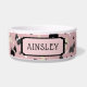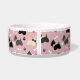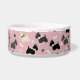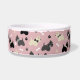 Cute black, grey and wheaten Scottie dogs wearing bows, with pawprints and dog bones on a pink background dog bowl with your own custom pet name.