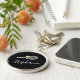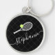 Black and white personalized keychain with a tennis racket monogram in an elegant and cute calligraphy script font with a subtle net pattern background.