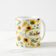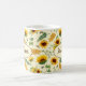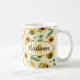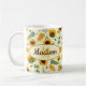 Customizable name and monogram mug with a print of painted garden sunflowers and honey bees, yellow and green colours.