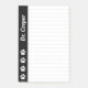 Personalized lined post it notes for a veterinarian. Classy minimalist design in black and white with paw print decoration and discrete grey lines. Customize it by replacing the sample name Dr. Cooper with your own name or any other custom name you want to print on the notes. Great custom post it notes for a veterinary doctor to use in his practice.