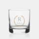 Custom name rocks glass is shown with a winner's gold wreath print with a sample initial and name.