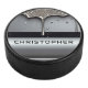 Polished chrome nameplate reading NAME with dripping liquid metal and strong reflective highlights. Embossed 3D typography on a sleek dark background evokes luxury, modern branding, industrial design and custom identity.