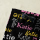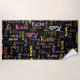 Typographic short personalized name text warm yellow, pink, grey, and white on a black background towel. Background colour can be changed if required. Personalized graphic text personalized design ideal for making sure you mark your sunbed or don't lose your towel around the pool. Personalize with your own short name, currently reads Katie for help with personalization and other name lengths please contact me. Designed by Sarah Trett for www.mylittleeden.com only on Zazzle.