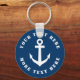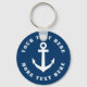 Custom nautical anchor keychain for boat captain. Navy blue and white ship anchor design. Round button key chain for sailor, skipper, captain, first mate etc. Cute gift idea for men and women who love sailing or boating. Add your own surname, boat name, thank you message etc. Also nice as party favour for guests at beach destination wedding.