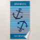 Enjoy total comfort at the beach or sitting poolside, and cool and dry off with this fun, colourful and comfy beach towel. With room to customize or personalize with a name, monogram, initials or (limited) text of your choice. Stand out in the sand with this beautiful contemporary ship anchor on a classic nautical blue and white stripes pattern background. Modern and stylish design for the sailor or boater, ocean or sea, boating, sailing or water sports lover.