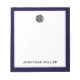 A professional notepad with a minimalist luxury design in navy blue and white. Brushed gold metallic emblem at the top with monogram name in classic typography on a simple white background, framed by a navy border.