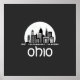 A minimalist and stylish black and white illustration of a city skyline, featuring several tall skyscrapers and a silhouette of a park below. The word "OHIO" is prominently displayed at the bottom, adding a touch of state pride. The overall composition is clean and modern, with a circular frame surrounding the skyline.