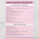 Real estate professionals can use this flyer not only as a checklist but also as a branding tool, showcasing their commitment to providing a seamless and memorable open house experience. The visually appealing pink and white background adds a touch of modernity and sophistication, making it stand out from traditional, plain checklists. The design is not only eye-catching but also functional, ensuring agents have all the information they need at their fingertips.