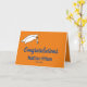 On the front, this orange graduation card has a white graduate's cap in the upper left corner. The display text says 'Congratulations' in dark blue script. Also, there's a place for the graduate's name in dark blue text. You can even add the class of year under the name. Inside of the card, there's an inspirational message. You can personalize the inside message with the graduate's name and your name as the sender too.