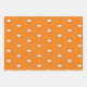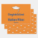 Congratulations! A white graduate cap is above the word 'Congratulations' in white script. Personalize with the graduate's name and year of graduating class. The other sheets have a pattern of white graduation caps. The wrapping paper is orange.