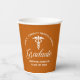 This custom orange medical school graduation party paper cup features classy white typography under a medical caduceus and your college name for the class of 2024. Customize with your graduating year under the elegant calligraphy for great personalized university graduate decor for a nurse or doctor.