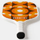 Trendy durable pickleball paddle with contemporary dark yellow, bright orange and white coloured geometric circles pattern on a brown background. With option to customize or personalize with a name, monogram or initials of your choice. Ornate, elegant, stylish and eclectic design for the fancy artistic fashionista, the artsy fashion diva, popular hip trendsetter, vintage retro art style and abstract digital geometric motif lover. Did you know August 8 2023 is National Pickleball Day? Get yourself a new paddle to celebrate and play a tough game on the court with it!