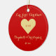 Custom, personalized, beautiful, festive christmas red, elegant, faux golden typography / script, golden heart, monogram, newlywed couple, husband & wife, first holiday christmas keepsake ceramic porcelain ornament with a strand of gold thread to hang it. To customize, simply type in the name of the newlywed husband & wife, year, the couple's initials, and the family name / last name of the couple. Makes a wonderful keepsake for the bride and groom, newlywed couple.