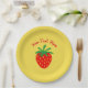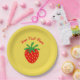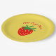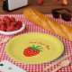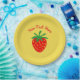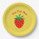 Custom paper party plate with red strawberry design. Cute party accessories with fruity print. Yellow green and red colours. Add your own personalized text. Great for kids Birthday, wedding, dinner party etc. Available in different sizes fro serving homemade cake, sweets, pastry food, desserts and more.