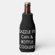 Custom printed personalized BOTTLE COOLER Blank Template with EXAMPLE OF BLACK BACKGROUND PRINT (change to any colour or clear) - 3"diameter, 7" high. Design, create, make your own. Your photo, image, text, logo, graphics in full colour edge-to-edge print on the entire area (all sides and bottom) of the foam cooler can cover. Fits any standard 12 oz. bottles. Collapsible high density open cell polyurethane foam for easy storage. Made in the USA. Great volume bulk multi purchase discounts.