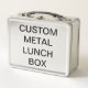 Custom printed personalized RED METAL LUNCH BOX Blank Template - 6.75” high x 8.625” wide x 3.75” deep, Weight: 12 oz. Design, create, make your own. Your photo, image, text, logo, graphics in full colour print on one side or on both sides of the lunchbox. Food contact safe interior material, durable - CPSIA complaint - tin plate, with collapsible black plastic handle. Choose from 6 base colours: White, Stainless, Black, Dark Blue, Light Blue & Red. Best for kids for school and for classic lunch box fans.