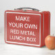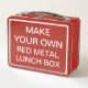 Custom printed personalized RED METAL LUNCH BOX Blank Template - 6.75” high x 8.625” wide x 3.75” deep, Weight: 12 oz. Design, create, make your own. Your photo, image, text, logo, graphics in full colour print on one side or on both sides of the lunchbox. Food contact safe interior material, durable - CPSIA complaint - tin plate, with collapsible black plastic handle. Choose from 6 base colours: White, Stainless, Black, Dark Blue, Light Blue & Red.