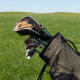 Custom personalized golf driver head cover with dog face photo and monogram name initials. Great gift idea for a keen golfer.