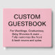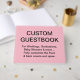 Custom printed personalized GUESTBOOK 11" x 8" Blank Template with EXAMPLE OF PINK BACKGROUND PRINT ON FRONT COVER (change colour, replace or clear). Design, create, make your own. Your photo, image, text, logo, graphics in full colour print on the front and back covers, and the spine of the guestbook. 61 sheets; 122 pages. Laminated front and back hard covers with a glossy finish, cover printed on silver halide photo paper. Standard non-customizable interior 70 lb cream coloured writing pages with vellum lining sheet - front and back. Protective outer box included - non-customizable.