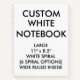 Custom printed personalized WIDE RULED NOTEBOOK with WHITE SPIRAL (6 Colour Options) Blank Template - 8.5" x 8.5" (60 sheets, 120 pages). Design, create, make your own. Your photo, image, text, logo, graphics in laminated full colour edge-to-edge print on the front and back covers of the notebook. 60 lb. durable text smooth paper, laminated front and back covers, CPSIA compliant. SHAPE OPTIONS: Rectangular, Square or Heart shape. SPIRAL COLOR OPTIONS: Black, White, Grey, Red, Blue or Green. PAGE DESIGN OPTIONS: Wide Ruled, College Ruled, Sketch, Practice, Sketch/Practice, Wide Ruled Sketch/Lined, Graph or Recipe (Heart shaped: Lined or Plain only). Best for school, college, kitchen, office, notes and ideas, and for birthday and Christmas gifts.