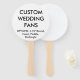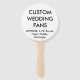 Custom printed personalized 5.75" ROUND WHITE WEDDING FANS (sets of 10) Blank Template. Design, create, make your own. Your wedding photo, image, message, text, bride and groom names, logo, graphics, in full colour print individually designed on both sides of the fan. 5.75" diameter. Available in white and ecru cardstock (customize to any colour). Simple assembly required - wood handles and 4 glue dots per fan included (available pre-assembled for an upcharge). Available Round, Heart shaped, Paddle or Rectangle.