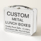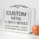 Custom printed personalized WHITE METAL LUNCH BOX Blank Template - 6.75” high x 8.625” wide x 3.75” deep, Weight: 12 oz. Design, create, make your own. Your photo, image, text, logo, graphics in full colour print on one side or on both sides of the lunchbox. Food contact safe interior material, durable - CPSIA complaint - tin plate, with collapsible black plastic handle. Choose from 6 base colours: White, Stainless, Black, Dark Blue, Light Blue & Red.