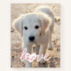Personalizable pet photo template design together with a script text that reads: "love". The letter "O" is replaced with a heart shape. On the heart there are some dog paw prints and a personalizable text area for the name of the pet. The text is written in pink and white colour scheme. You can add different photo on the other side.