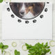 Destei's personalizable pet photo template design featuring some dog paw prints on the edges and a personalizable text area on the top. The photo is placed in the middle in a round shape together with a thin black border. You can change the colour of the paw prints and the text to any other colour, if you wish.