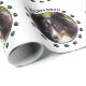 Destei's personalizable pet photo template design featuring some dog paw prints on the edges and a personalizable text area on the top. The photo is placed in the middle in a round shape together with a thin black border. You can change the colour of the paw prints and the text to any other colour, if you wish.