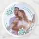 A modern and simple invitation with a picture in a turquoise flower wreath. The background is gradient white and grey