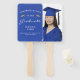 Help your graduation guests keep cool during the ceremony or party with these custom photo graduation hand fans, featuring the words "Congratulations to our Graduate" in white text on a blue background. The word "Graduate" appears in a graceful handwriting-style script. A pair of gold faux glitter mortar board caps and a scattering of gold confetti decorate the top portion of the label. Personalize one side with your grad's name, school, and year of graduation. Easily replace the sample image on the other side with a photo of your grad.