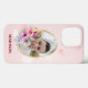 Your favourite photo is in a floral frame with gold details and a pink background with hearts. Optional monogram