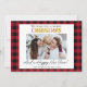 This custom photo Christmas card features a bold red and black buffalo check pattern, giving it a rustic yet stylish feel perfect for the holiday season. The personal family photo is centred, framed by the classic chequered pattern, which adds a touch of warmth and cozy charm. Above the photo, the phrase “We Wish You a Merry Christmas” is written, with “CHRISTMAS” in printed shimmering gold lettering for a festive pop against the plaid background. Below the image, a handwritten script shares “And a Happy New Year!” followed by a customizable family name, like “The Hopkins Family.”
