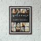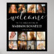 Elegant graduation welcome poster sign featuring a stylish black background that can be changed to any colour, a 11 photo collage of the graduate, the word "welcome" in a calligraphy script font, their name, and the class year.