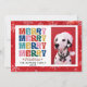 This is a fun and festive Christmas card with large, colourful letters that spell “MERRY” repeatedly in bold, playful font. Next to the bright text is a space where you can add your own picture—whether it's a family photo or your pet in a Santa hat. Underneath, there’s a spot to personalize the card with your family name and the year. The background is light blue with small white snowflakes, giving it a wintry feel. It’s a cheerful and easy-to-read design, perfect for sharing some holiday joy with a personal touch!