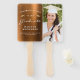 Help your graduation guests keep cool during the ceremony or party with these custom photo graduation hand fans, featuring the words "Congratulations to our Graduate" in white text on a copper faux brushed metal background. The word "Graduate" appears in a graceful handwriting-style script. A pair of gold faux glitter mortar board caps and a scattering of gold confetti decorate the top portion of the label. Personalize one side with your grad's name, school, and year of graduation. Easily replace the sample image on the other side with a photo of your grad.
