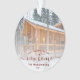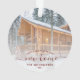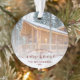 Commemorate your first Christmas in your new home with this beautiful modern keepsake ornament. The dark red text reads "First Christmas in our new home," with the words "new home" in elegant handwriting script with flourishes before and after. Replace the sample image with a photo of your new house and add your family's last name. A white gradient filter helps make the text pop.