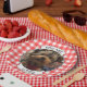 Customizable, personalized photo frame template with a red chequered buffalo plaid pattern background. Copyright © Angi Laframboise.