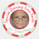 These festive, Christmas themed sticker gift labels feature an outer green frame, followed by a red and white peppermint candy cane pattern frame. The message "Special Delivery from Santa" is printed at the top in a whimsical red font. A sample name is printed at the bottom in green. A photograph is placed in the centre which you can replace with your own child's photo or custom image.