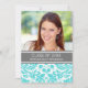 Graduation party invitation custom photo template card in elegant and sophisticated turquoise aqua blue, dark charcoal grey and white classic vintage floral damask pattern. Customize this grad announcement card by adding the year of your graduation, your photo, and your graduation party details.