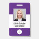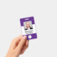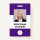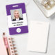 This badge features a simple, modern purple and white background for a professional look. Customize it with your square photo, name, job title, logo, company name, address or other information, and optional barcode.