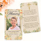 Our thoughts and prayers are with you during this time. Grief is painful, we could only hope that our Custom Photo Memorial Floral Funeral Prayer Card, with beautiful watercolor flower accents along the border, could help bring a little light into this sad time. This memorial prayer card can be given as a keepsake at a funeral, celebration of life, vigil or sent as a special tribute to those who were unable to attend. Personalize your memorial funeral prayer cards with a favourite photo. You can choose to use the poem that we wrote that is on the back of the card, or add you own favourite poem, prayer, or bible verse.