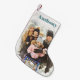 Turn a favourite photo into a special personalized Christmas stocking. This photo stocking is ready to be personalized with a name in bold teal blue white lettering against an antique ivory white overlay at the top of the stocking.