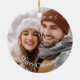 Celebrate the magic of both love and the holiday season with this ceramic Christmas ornament. This ornament complements the pink poppy and eucalyptus floral motifs found in our wedding stationery suite, creating a harmonious and memorable connection between your special day and the festive celebrations. The bride and groom's names and wedding date or year can be incorporated into the design, personalized just for you and your significant other. Turn the ornament around, and you'll find your favourite photo, capturing a cherished moment from your wedding day or journey of love. Adorned with the heartwarming message "Merry Christmas," this reverse side serves as a delightful reminder of the love and joy you share as you celebrate the holiday season each year. This ornament will be a loving addition to your Christmas tree as well as a cherished keepsake that will forever hold the memories of your wedding day.