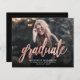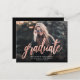 Modern graduation announcement featuring a custom horizontal photo. The word "graduate" appears in rose gold faux foil script, with the graduate's name, school, and year of graduation below in white sans serif font. Easily replace the sample image with your own graduate's photo. A black gradient screen helps ensure the text pops. The reverse is solid black. Ideal for high school or college graduation.